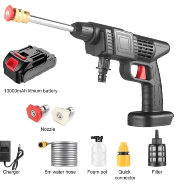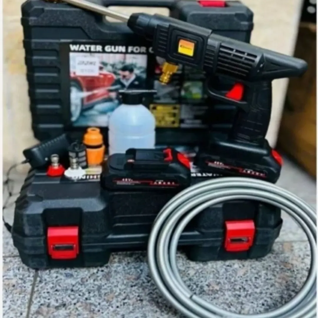 کارواش شارژی تفنگی پرتابل با توان موتور ۲۶۰ وات، حداکثر دبی آب ۸ بار، حداکثر دمای آب برای استفاده ۴۰ درجه، دارای شلنگ آب ۵ متری و باتری شارژی لیتیومی جداشو ۴۸ ولت. قابلیت مکش آب خودکار از مخزن و نازل های آب متفاوت برای شستشوی خودرو.