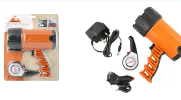 این محصول یک چراغ LED نقطهای (اسپات لایت) با گیج فشار لاستیک (تایر گیج) است. این چراغ LED با یک منبع نور LED بسیار قدرتمند کار میکند و باتری لیتیم یونی آن برای سالها دوام دارد. این دستگاه در یک محفظه پلاستیکی سبک و بادوام قرار گرفته است و همچنین دارای یک چراغ جانبی 10 تکه LED است. این محصول برای استفاده در خارج از جاده مناسب است.